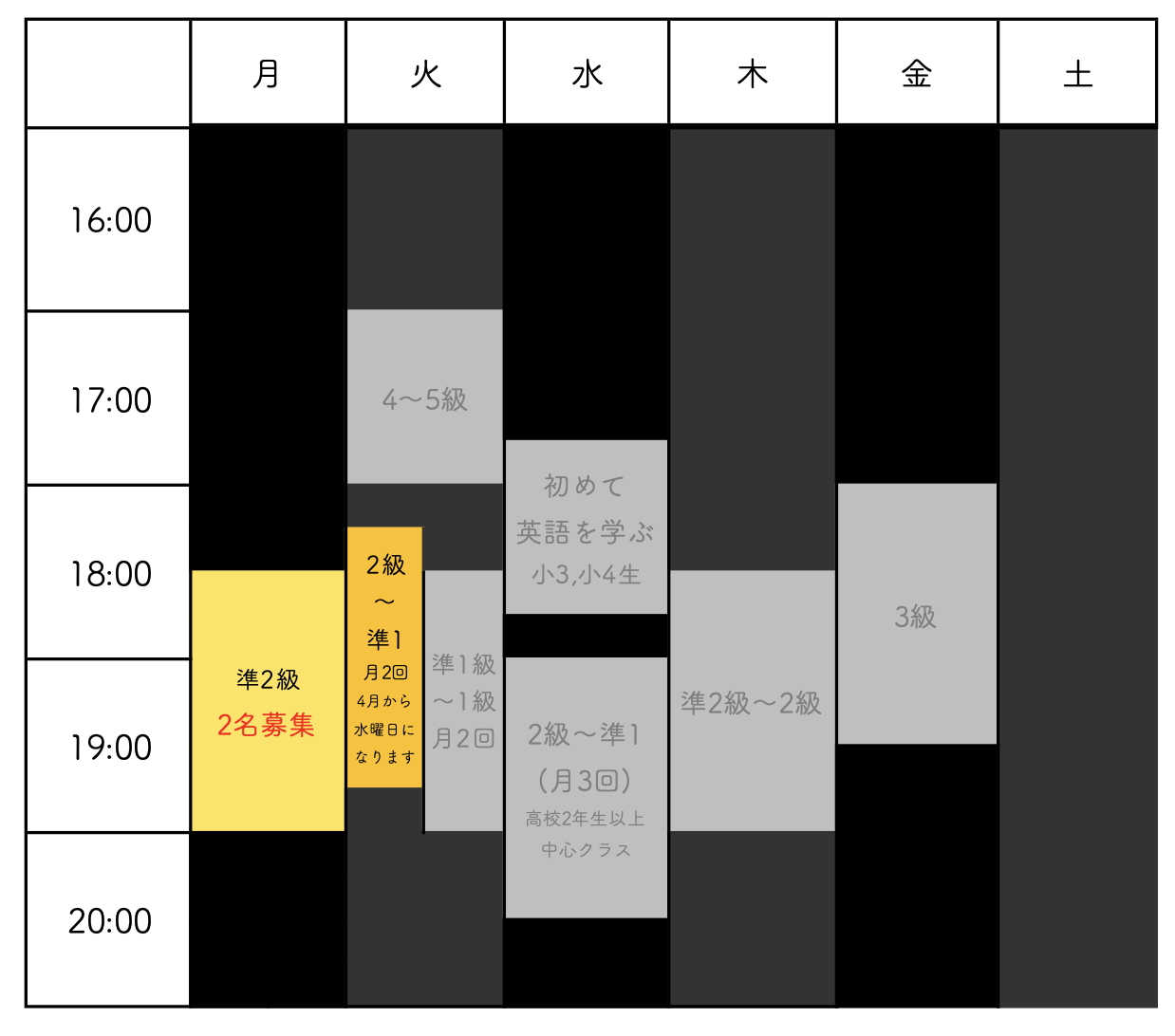※灰色になっているクラスは定員がいっぱいになったため募集を止めております。空きが出た場合にはHP上で色がつきますので、もしそのタイミングを捕まえられてご縁をいただけそうでしたら、是非お声かけください。最大定員数は16名ですが、灰色は16名が所属していっぱいになっているという意味ではなく、生徒さんの年齢やクラスの状況に応じて、また教室全体の運営上の都合に応じて、その時々に応じて定められた定員がいっぱいになっているという意味です。なぜ一般的な「少人数」クラスではないのかについてはこちらをご覧ください